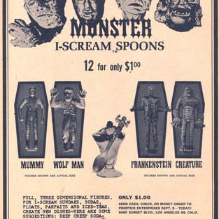 SIDEBAR: The subsequently issued collectors sets (the Mon-Stir Swizzle Stick set, and the Monster I-Scream Spoons, featured only four monsters; absent was Count Dracula and, understandably, the Invisible Man (or maybe he IS in the set….).